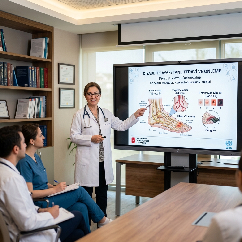 Diyabet hastalarında ayak sağlığının sürdürülebilirliği, komplikasyonların erken teşhisi ve önlenmesi stratejileri. Bu sunum, hastaların ve sağlık profesyonellerinin diyabetik ayak risklerini en aza indirmek için izlemesi gereken adımları detaylandırır.